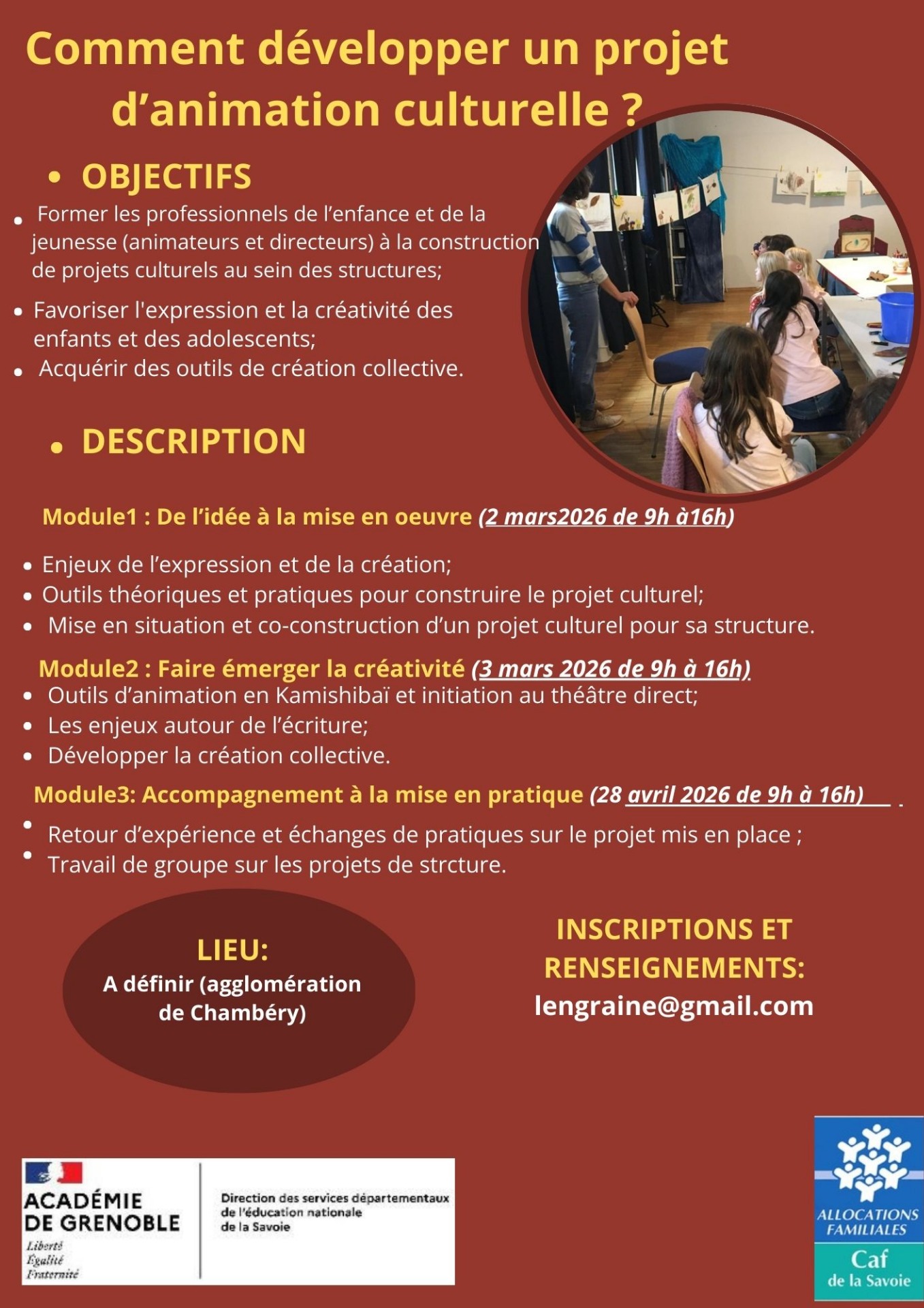 Cette année nous continuons de développer nos cyvles de formation en lien avec l'éducation nationale et le le Service départemental de la jeunesse, de l'engagement et des sports de Savoie. Nous proposerons en mars deux modules de formation à la création de projets culturels suivi d'u module de mise en pratique au sein des structures en avril.